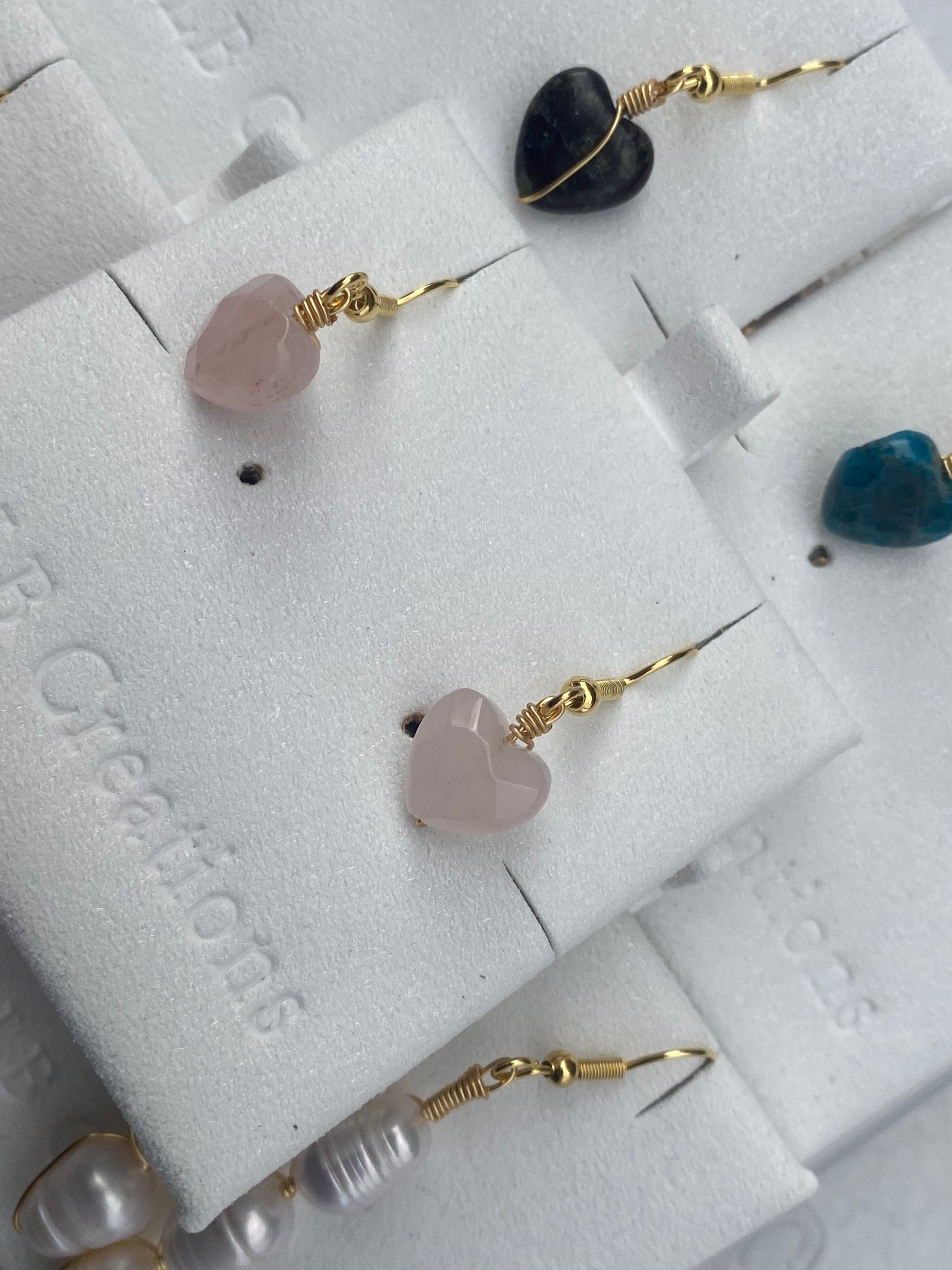 Wear your heart on your ears. These sweet-but-bold rose quartz hearts are wrapped in copper wire and finished with 18K gold-plated stainless steel hooks, lead-free, nickel-free, and full of love.